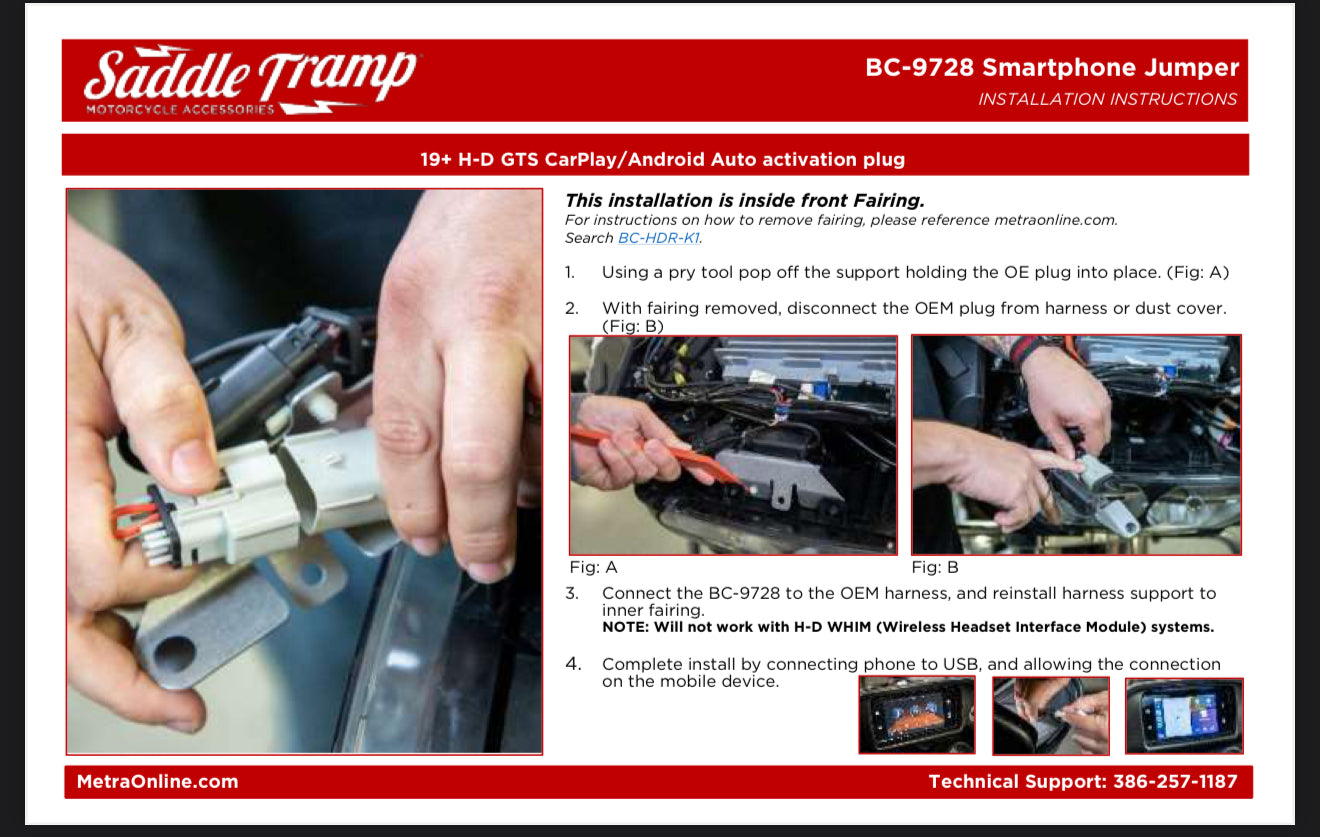 This jumper harness is designed to enable the use of Apple CarPlay® and Android auto on 2019-Up* Harley-Davidson® Touring models equipped with GTS (Touchscreen) radios. No cutting of wiring is required; simply connect it to the open factory harness within the front fairing. Refer to the vehicle applications tab or chart for more information.